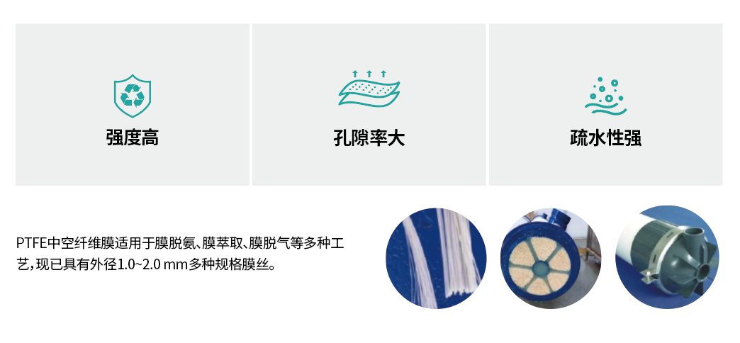 PTFE中空纤维疏水膜是一种由聚四氟乙烯(PTFE)制成的中空纤维膜。PTFE中空纤维膜具有高孔隙率和自支撑性、装填密度高的优点,整个制膜过程仅使用少量润滑剂,无任何废液产生,制备工艺绿色环保。